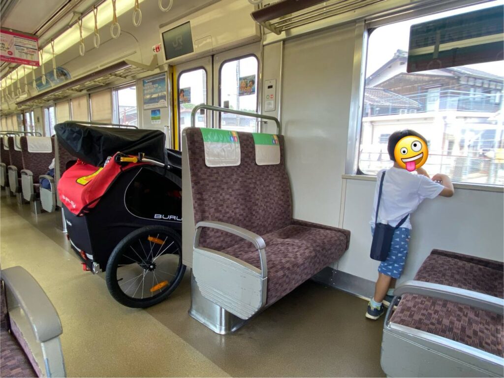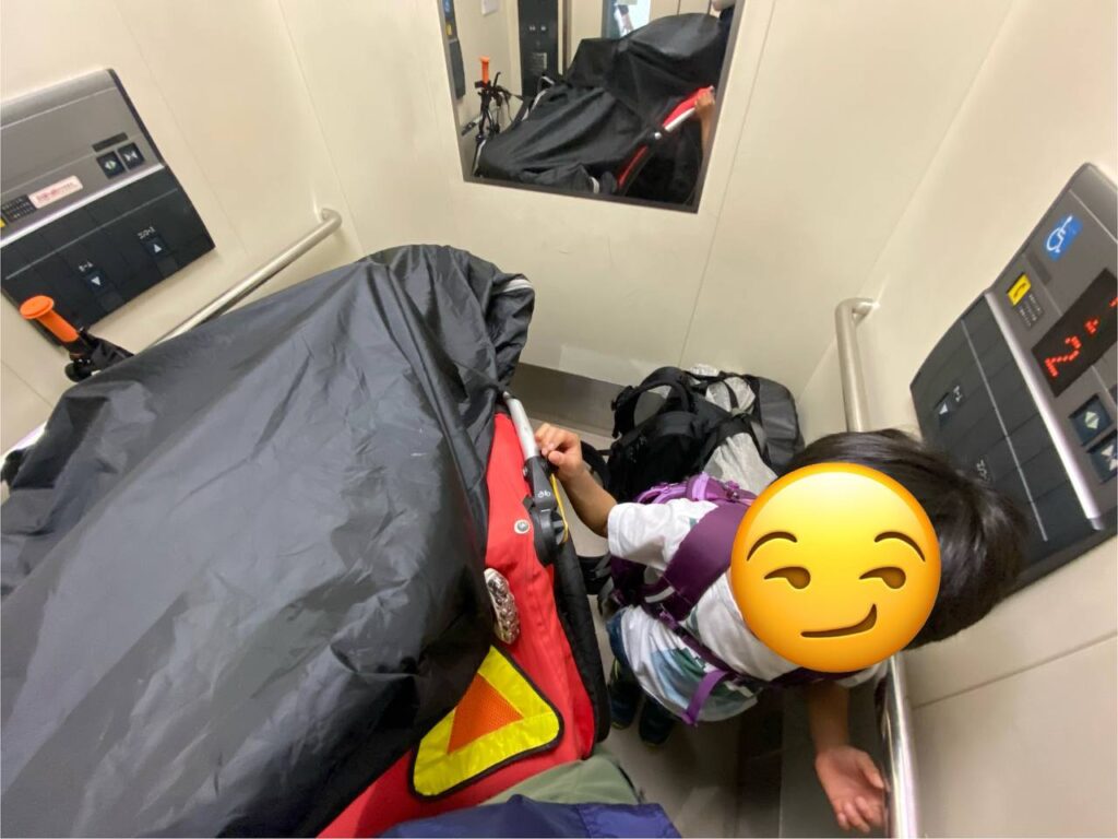 エレベーターでは、最初に長男を乗せて開くボタンを押してもらい、ブロンプトンを角に置き、扉に引っ掛かる子供自転車をゴソゴソ動かしながらトレーラーを乗せる、狭かったらトレーラを斜めにする、という方法でだいたい1回で乗れました。逆に言うと、どうしても2回に分けないと移動できないのが新大阪駅の地下鉄・JR間、2F・3F間です。スペース場所確保のため、とりあえず一旦違う方向でも乗らないといけませんし、この荷物全部は乗りません。