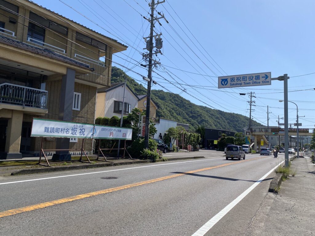坂祝(さかほぎ)通過(岐阜県加茂郡坂祝町)。まだ登らないけど祝ってくれるっぽい。
