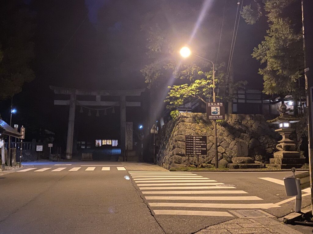 飯田に出てもとのコースに合流。ここから地味にアップダウンがある、と参加案内には書いてあった。しかし、段々とダウンが少ないことに気づく(飯田市の標高は499m、伊那市632m、諏訪市761m)。伊那市で気温が下がったようで、また「寝たら死ぬぞ」の状態になり、コンビニにピットイン。またカフェラテを飲むが、先ほど同様、根本的にはしっかり漕いで体を温めるしかない。PC3の手前で次の登坂用に飲料を購入、未明に諏訪大社のPC3有人チェックポイントに到着。