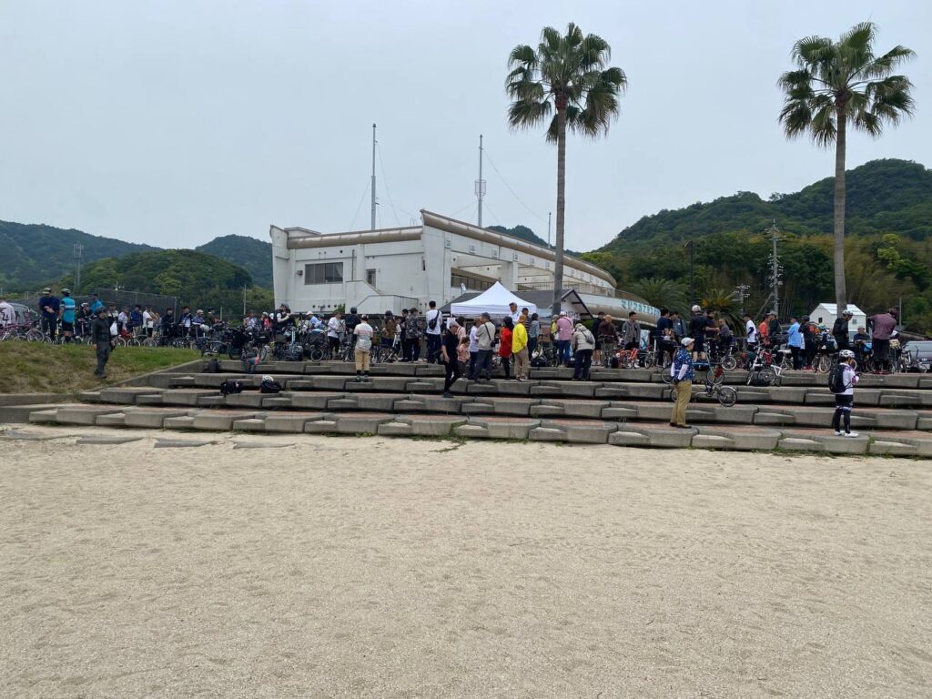 しばらくして、ブルベで顔なじみの紫芋兄さんさこっちさんと合流。紫芋兄さんはリアのフリーハブが壊れて漕げども進まない状態で辿り着き、さこっちさんは徳島~むろと廃校水族館(高知)~四国カルスト(マリンシューズで!)~松山で現地入り。さこっちさんはAudax Japanのジャージを着て、ブルベ界隈でなぜか人気のぶりのぬいぐるみを持っていたので、はじめましての20000さんも引き寄せられていました。