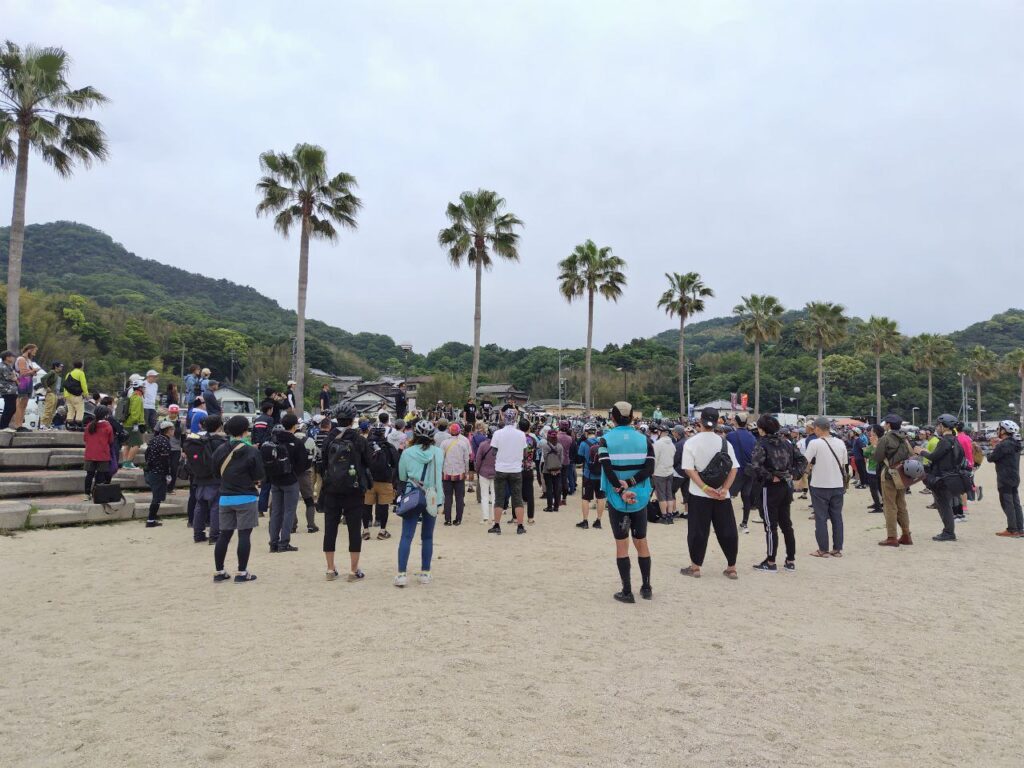 ミーティングではキッチンカーが出店するとのことで楽しみにしてはいましたが、初参加で状況が分からなかったのでコンビニで食料も買っていくことにしました。9:30にキャンプ場を出発、最寄りのコンビニのファミリーマート 多々羅大橋前店で買い込んで併設の休憩所で荷物整理をしていると、もうひとっ走りして来たと思われるサイクリストが次々とやってきました。