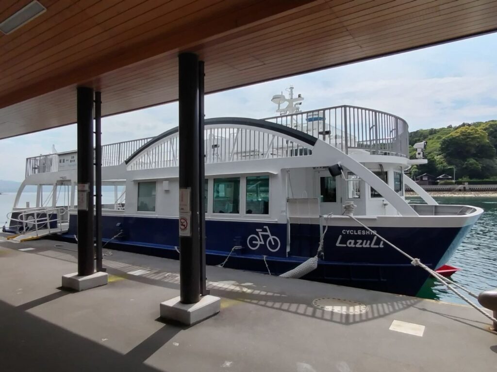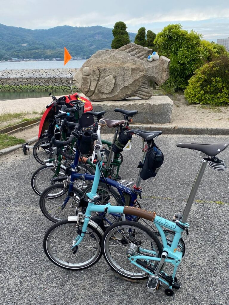 参加者が多くて映り込みを避けるため待ったこともあり、お別れは13:30になりました。当初は約54km、尾道駅まで走る計画でしたが、この日は午後から雨&オール向かい風の予報。新幹線の特大荷物スペース付きの指定席を取っていて、遅らせると確保し直すのは難しいだろうと思い、プランBに切り替えました。といっても、公式のBROMPTON JUNCTION KOBEのブログで例として案内されていた、15:00 生口島(いくちじま)・瀬戸田港より船に1時間ほど乗って尾道駅に出るというルートです。当初は13時過ぎ出発と考えていたので、2時間で17kmなら余裕、と思っていましたが、1時間半で輪行準備とチケット購入を考えたら結構ギリギリな気がしてきました。