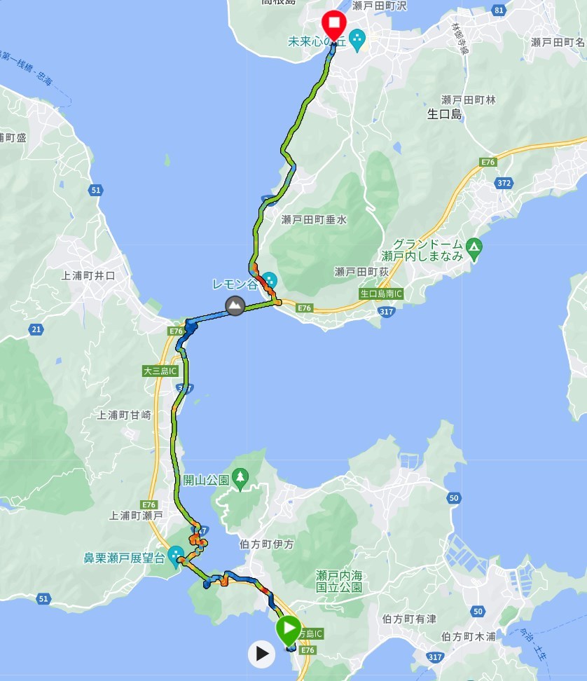 この日のルートです。目的地は道の駅 伯方S・Cパークです。