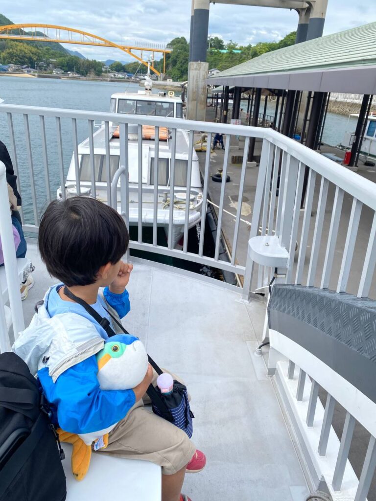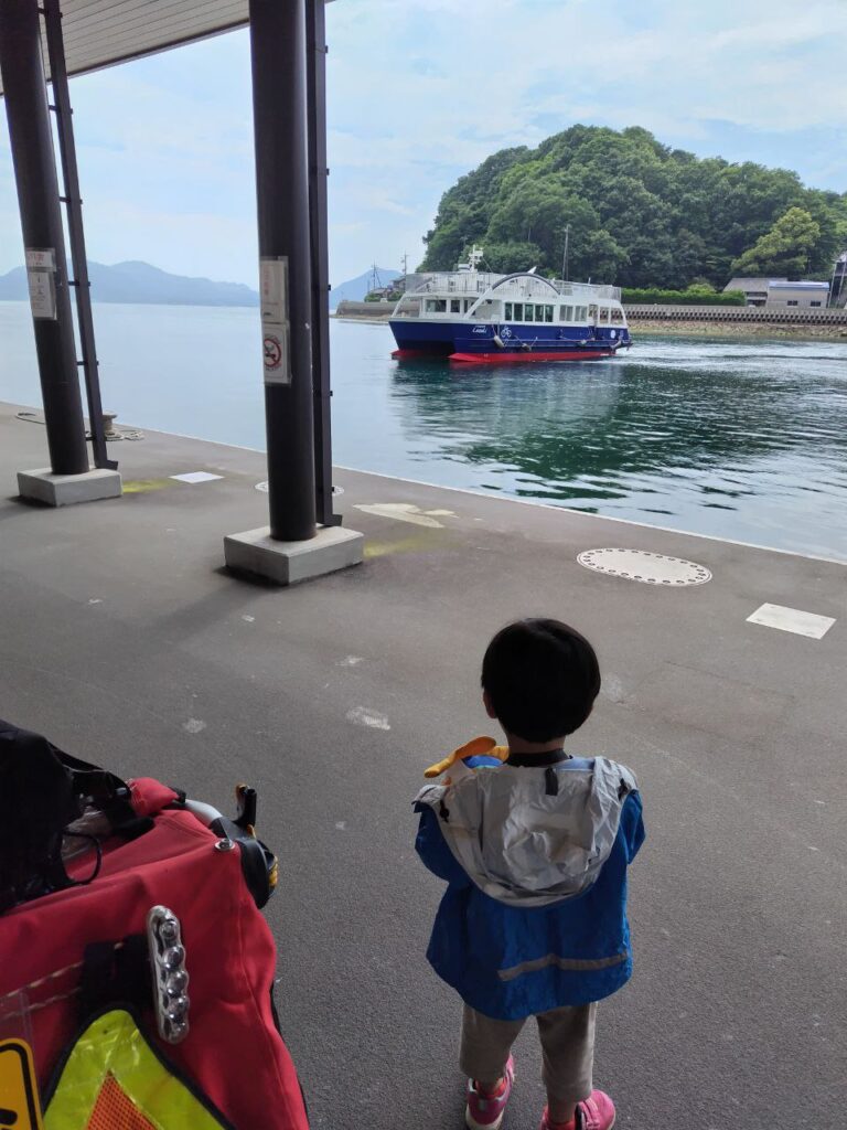 ブロンプトンを輪行袋に入れ、チャイルドトレーラーにしまってベビーカーモードにして乗船の列に並びました。事前にチケットを買う必要がなかったので、少し時間の余裕がありました。並んでいるときに支払いがあり、1800円でした。親子+自転車+トレーラーで3000円くらいになると思っていたので内訳がすぐに分からなかったのですが、大人 1300円、幼児無料、トレーラー(自転車扱い) 500円だったのではないかと思います。