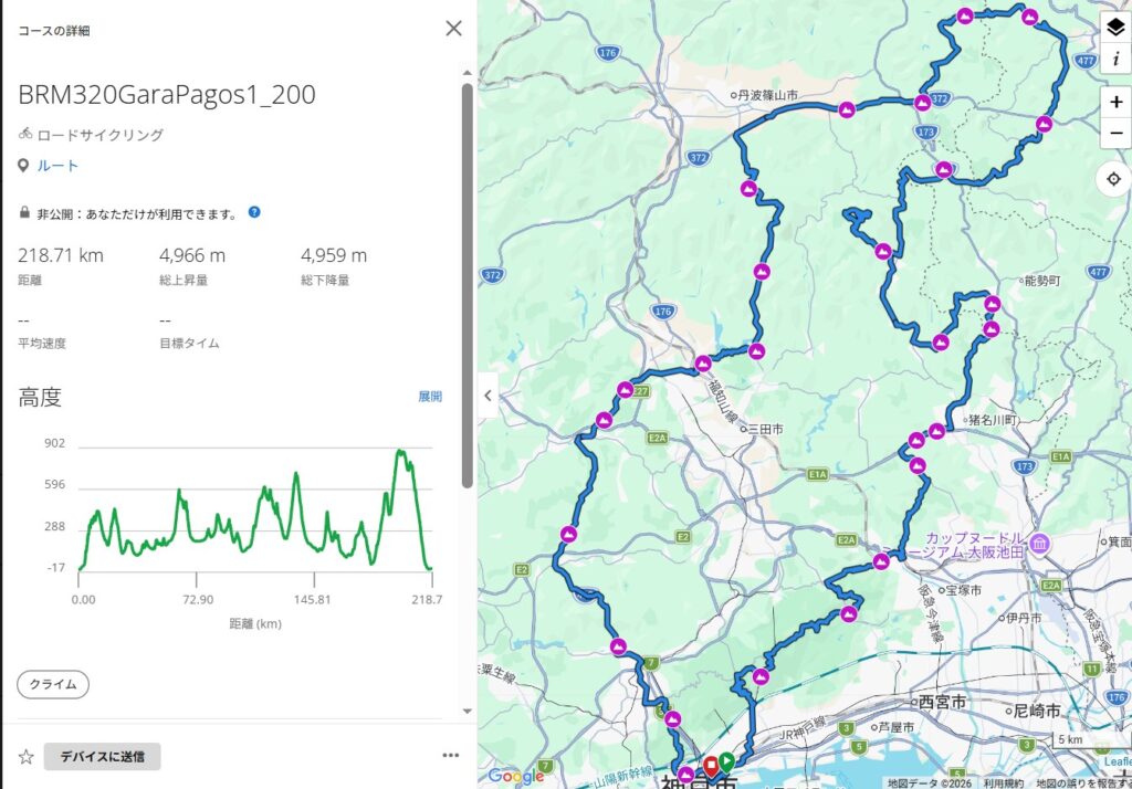 今年から神戸発山岳ブルベはVT (バーリトゥード)からGara Pagos (ガラパゴス)に変化(へんげ)。新年早々の300km・Stage. Zero(GaraPagosゼロ)は後半から調子が戻り完走。200kmで累積標高5000m以上となるGaraPagos 1は、長距離耐性より繰り返しの瞬発力が必要なコースで、私の苦手とするブルベになる。が、半分ほどは去年の200VTと同じだったし、来たばかりの新しいクロモリロードバイクでどこまで走れるのか試してみたくエントリーすることにした。