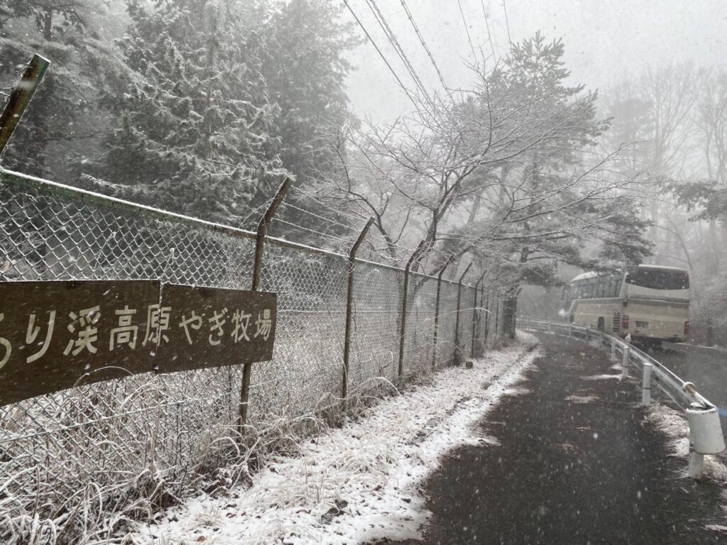 2つ目の登りの途中から、顔が痛くなるほど冷たくて強い風が吹き付けるようになる。ヘルメットのシールドは曇り、外して頭上に装着していたらそこに雪が溜まっていた。アイウェアの外側にベチャベチャの雪が付着して視界は不良、サイコンは雪まみれで画面が見えなくなってしまった。さすがに諦めの境地。登りの後で見えた電光の気温表示は-3℃だった。