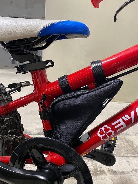 背面長39cmで身長100cmの子には大きいのですが、自分で着替えと食料を持ってもらうため、背負って走行することに慣れてもらいました。一応、普段の保育園のリュックの重さを参考にしています。それはそうと、子供は自転車のカゴを欲しがりますね。小さいフレームバッグを取り付けてやったのですが、今でもカゴがないことが不満そうです。