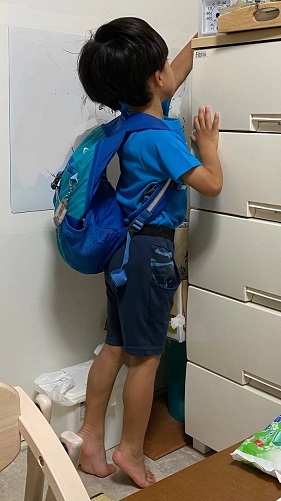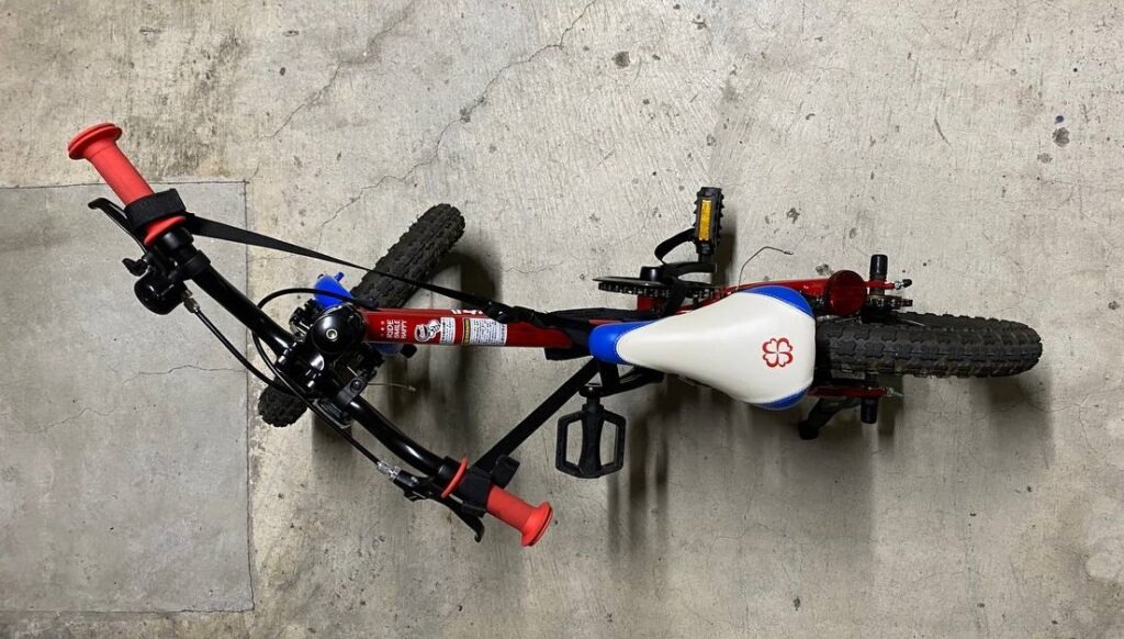が、3歳では大き過ぎて乗るのを怖がり、促すと押し歩きとブレーキを握る練習はしてくれるものの、ほとんどまたがってはくれませんでした。一応、右ペダルを3時に合わせて、助走を付けてから足を載せて漕ぎ出す、進みたいほうを見る、と教えました。そうこうしているうちにストライダーで蛇行運転、両足裏で後輪を挟んでロックして停まる、など暴走するようになり、4歳になったところでストライダーを封印。気づいた初日は泣いて怒って言うことを聞けず、右足でペダルを3時から6時まで踏んで終了。2回目も期待薄な挙動が続いていて”時間掛かりそうやな~”と思っていたら、たまたま左足がペダルをうまくキャッチして240°くらい回ったのです。本人は”またできなかった”という顔をしていたけど、私は素で驚いて「できたやん!」と言ったら、今まで見たことがないくらいニッコニコな顔をして、そこから急にどんどん漕げるようになりました。たまに褒めるの大事やねんな。押し歩きも車両感覚を養うのに役立っていたようで、これはあまり褒められたことではないですが、障害物とのギリギリのラインを攻めるのが上手だなと思いました。
