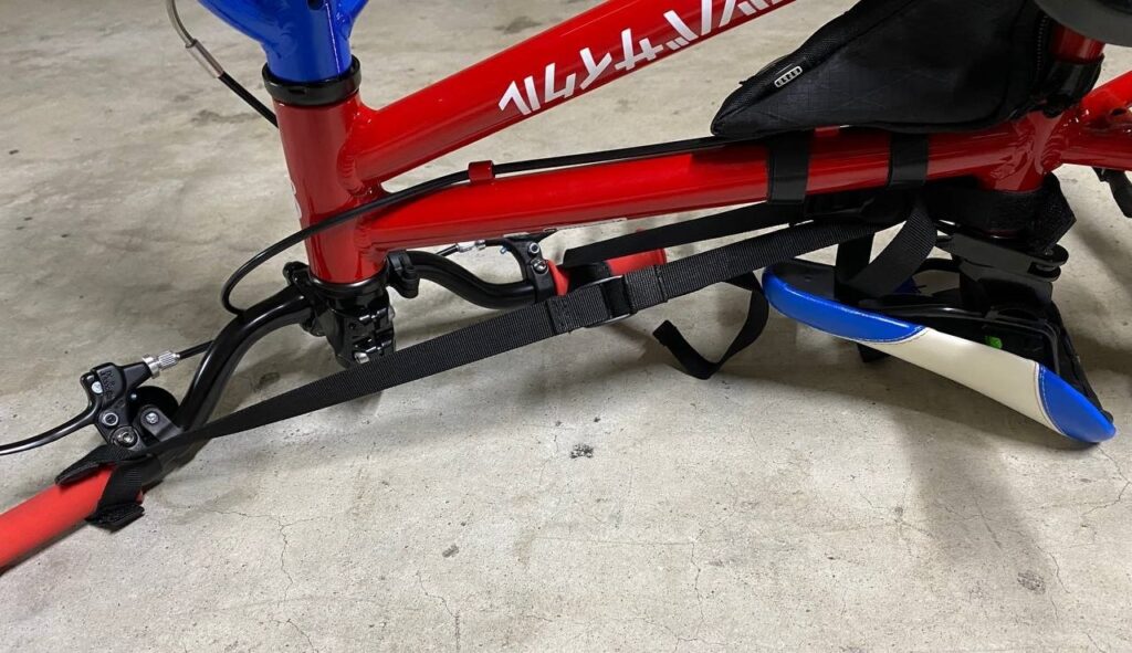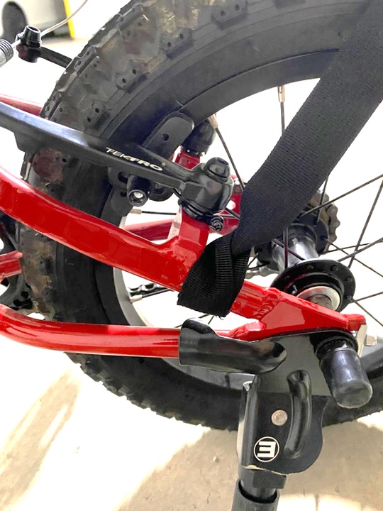 ハンドルを切って、片方は紐を1周させて短縮してから面ファスナーを巻きました。ベルトの長さを調節すれば子供自転車でもハンドルを固定できました。