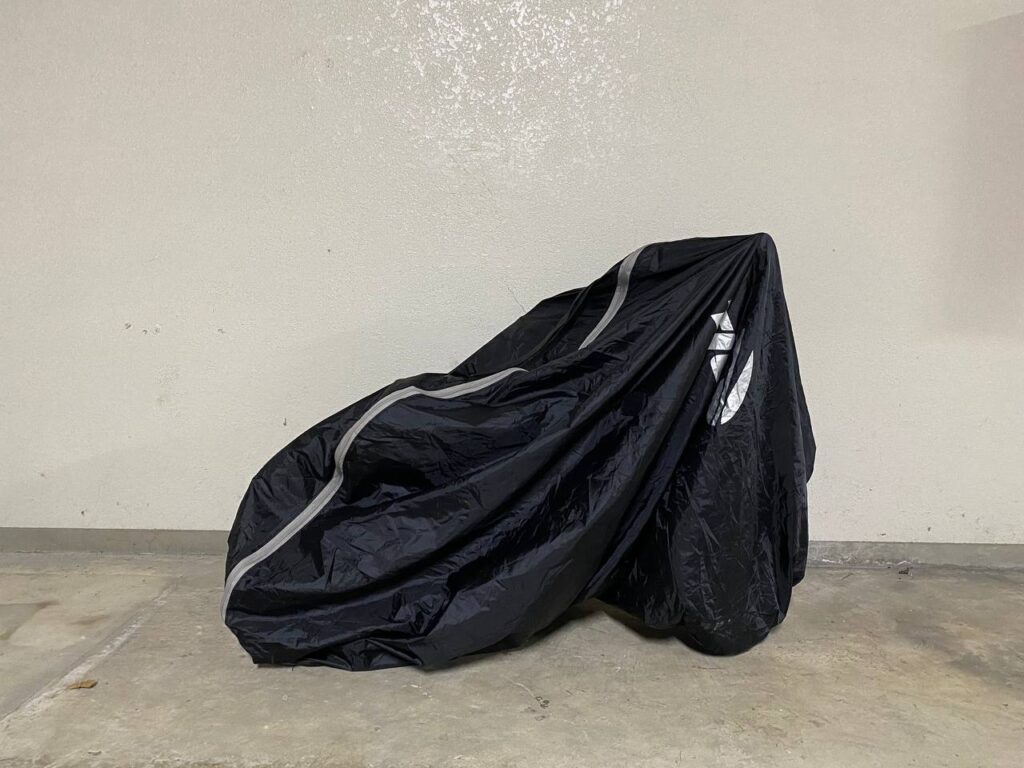 小さくて軽い自転車なので、自転車を上下ひっくり返して袋をかぶせ、また戻すほうが直接入れるよりきれいに入って楽でした。