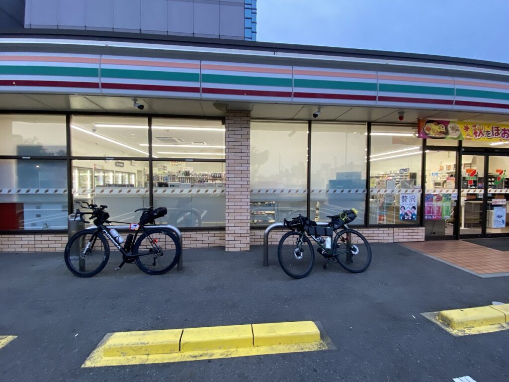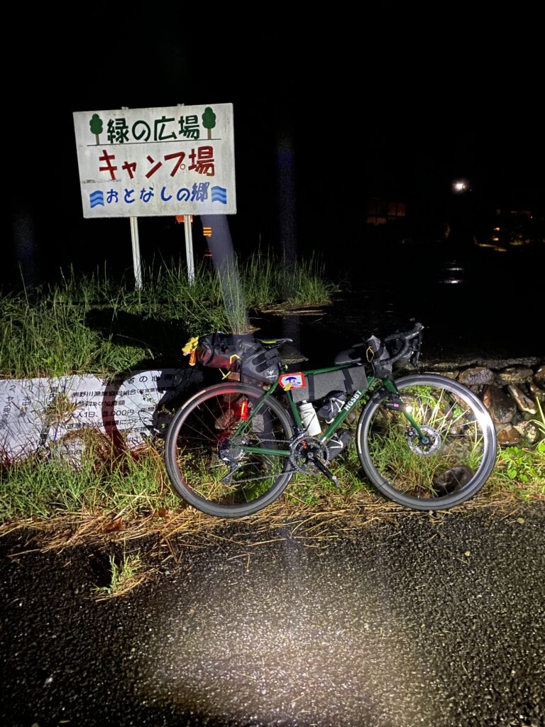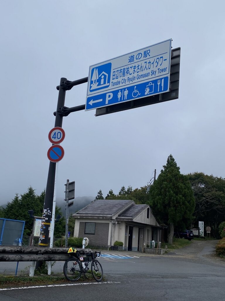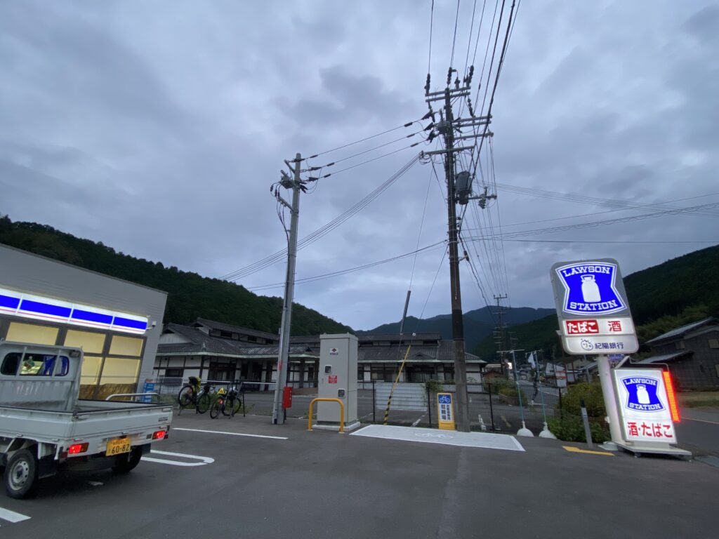 この辺りで唯一のスーパーが閉店した跡地にできた龍神の24時間営業のコンビニ。しばらく補給場所が乏しいため、翌朝の朝食と約100km分の食料を確保。雨が強くなってきたのでレインウェアを上だけ着る。