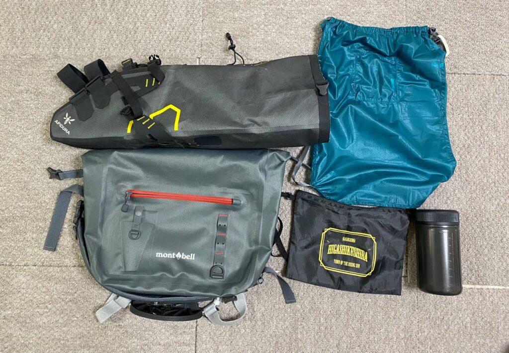 アピデュラ 防水タイプ ミディアム(14L)、モンベル ドライ アングラー ショルダーバッグ(14L・#1126201)、グランジ モッテコ1000 (スタート前に返送)、モンベル U.L.ナップサック(#1133369)