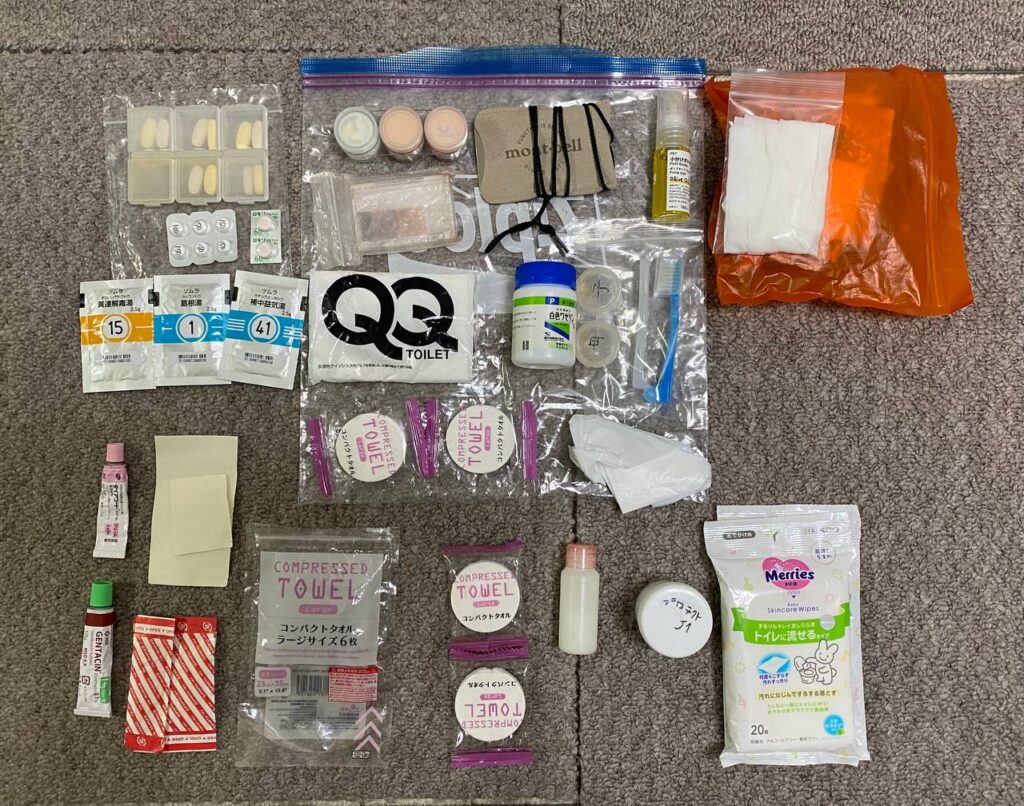日焼け止め・化粧品、モンベル ステンレスミラー(#1124184)、ワセリン、オリーブオイル(飛行機輪行のためここに入れたが、チェーンオイルとして使った)、ソフティモ Wヒアルロン酸配合メイク落としシート、サニタリー用品、歯ブラシ、歯磨き粉、ダイソー コンパクトタオル、ティッシュ、レジ袋 |