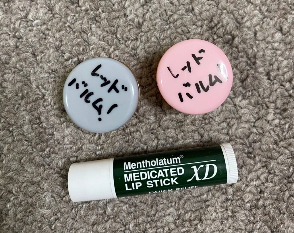 防寒着で補えない寒さ対策にスポーツバルム レッド3(推奨気温5℃以下)。あとはリップクリーム。