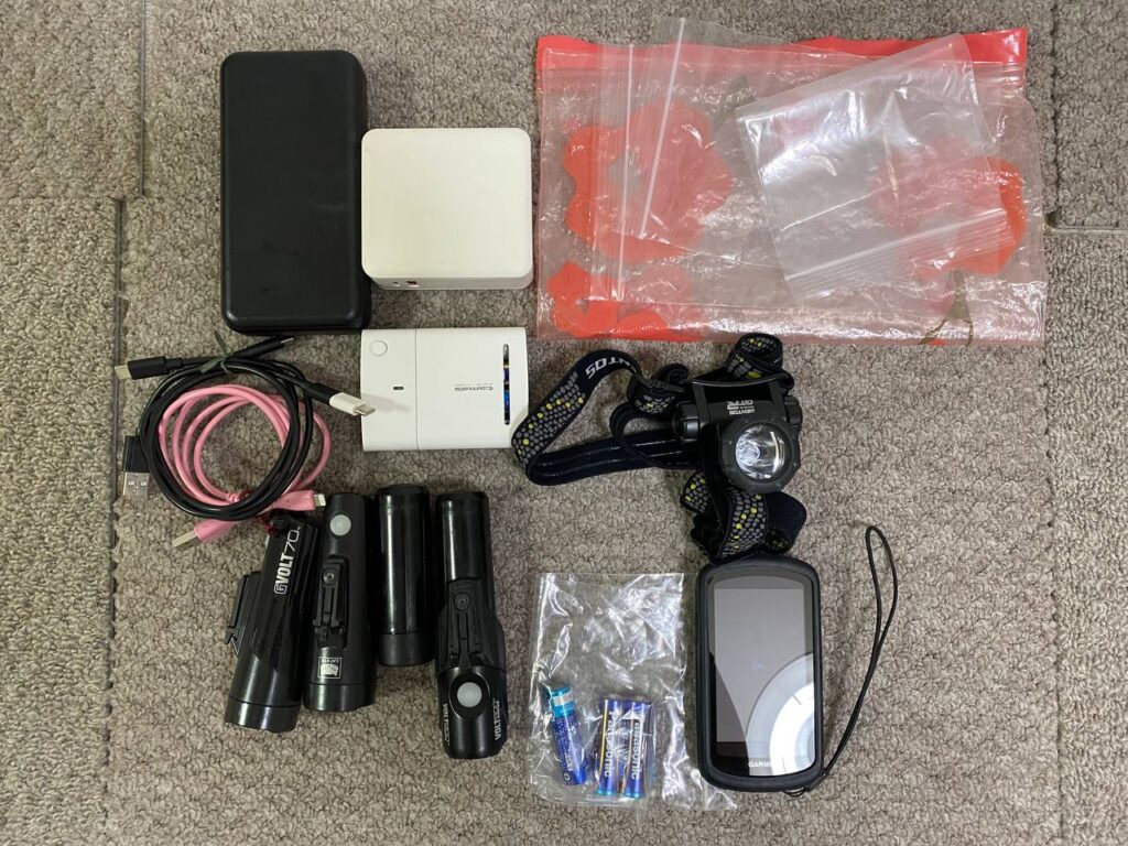 | 右半分 | 防水用のジップ付き袋、ジェントス LEDヘッドライト GTR-S31D(電池式)、パナソニック アルカリ乾電池単3形 EVOLTA NEO、ガーミン Edge1040 Solar |