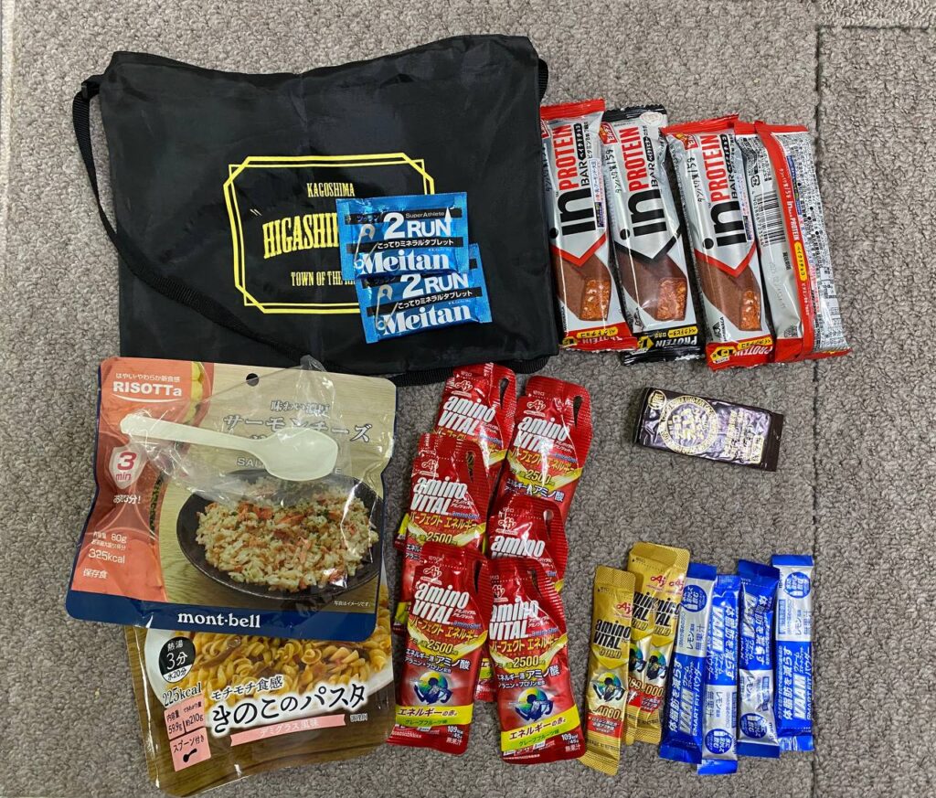 以上、全部含めて7.5kg。スタート前に送り返した物もあるが、飲料が増えて相殺され、車体含めると約20kgの装備でスタートしたと思われる。