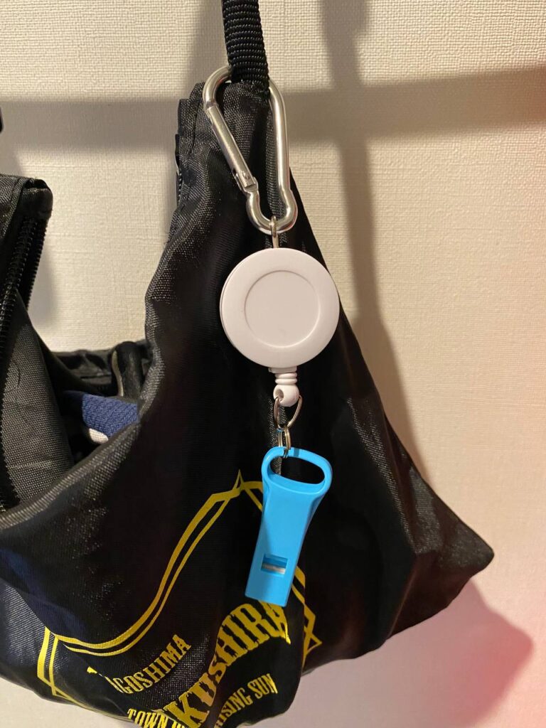 サコッシュには100均のリールとホイッスルを取り付けて、動物避けや万一の救助要請に使えるようにした。