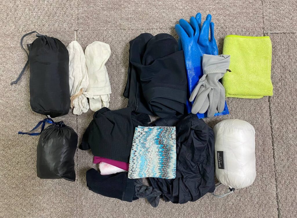 | 横1列目 | モンベル サイクル ドライシェル(廃番・#1130486)&バーサライトサイクルパンツ(#1130533)、Amazonで買った安い絹製5本指ソックス(防水ソックスの生地を傷めないように履く)、モンベル GORE-TEX オールラウンド ハイソックス(#1118611)、ショーワグロー テムレス、モンベル WIC.クール ライトグローブ Women’s(#1118673)、trusco マイクロファイバークロス |