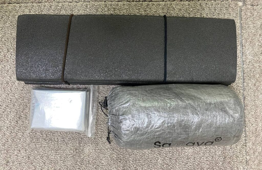 エバニュー FP mat 100を40cm幅にカットして折り目を増やしたもの(125g)、Amazonで買ったカサカサ音が少ない静音アルミブランケット(90g)、SAMAYA NANO BIVY (実測239g)