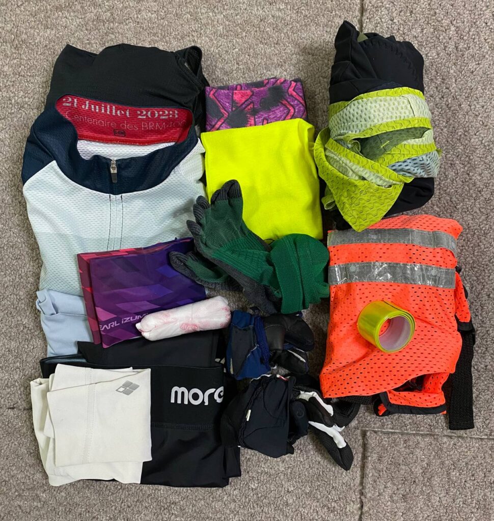 | 縦1列目 | モンベル ジオライン クールメッシュ タンクトップウィズブラ Women (#1107758)、オンヨネ ブルベ100周年記念ジャージ、ユニクロ シームレスパンツ(走行後用)、パールイズミ ヘアバンド、ダイソー 紙パンツ(仮眠・洗濯時使用)、モンベル トレール アームカバー ライト Men’s (#1107703)、 |