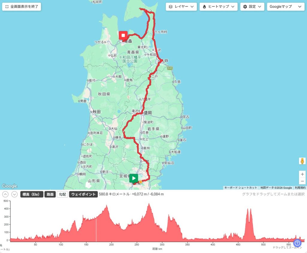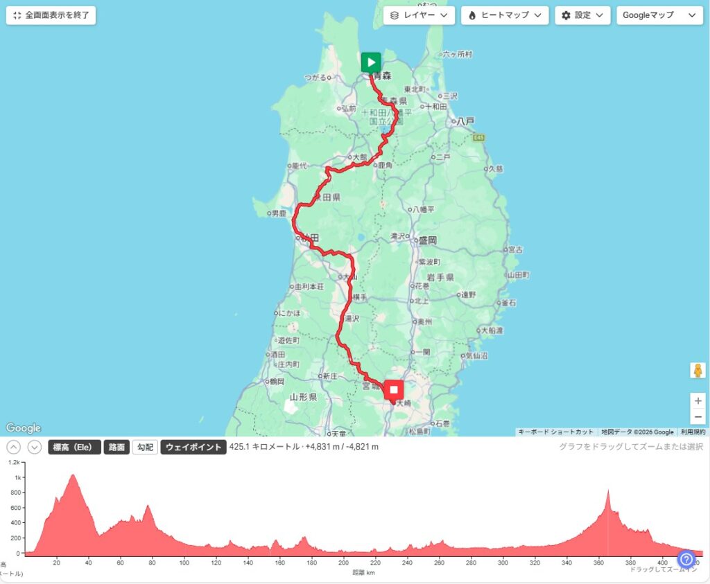 土曜の朝5時スタート、75時間後の火曜朝8時が〆、1005km・累積標高10,755mのまあ数値的には標準的なルートだ。大雨の影響により後半の秋田県の山道が通行止めになってルート変更がなされ、2泊目候補地で市街地を通るようになった。