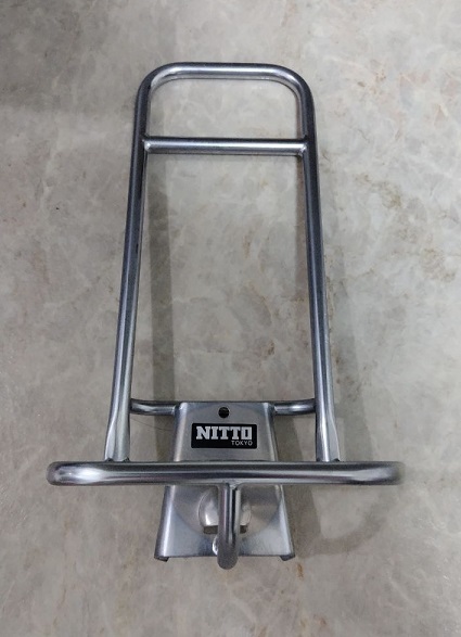 手持ちのブロンプトンのフロントバッグはやや重く、背負えないタイプだったので、手持ちのバックパックをフロントバッグのフレームにゴムバンドで固定する方法を取りました。自転車なしで活動する場面で背負い、両手が空くようにするためです。バックパックは、やや容量は小さいものの使い慣れているモンベルのクロスランナーパック 15 Women’s (#1133462の旧品)を選びました。バッグを取り付けるフレームとして、当初は和田サイクルオリジナルの日東(NITTO)製持ち手 BM-10F for BROMPTON (製品サイト)を考えていたのですが、若干重いのと、