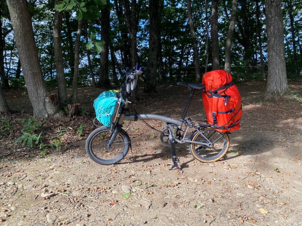 この旅の相棒はブロンプトンT Line Explore・12速。子どもと一緒なので距離はほとんど走りませんが、軽くて輪行が楽になります。そして荷物を後ろの載せるため、リアラックをショップで取り付けてもらいました。P Line/T Line専用のアドバンス ローラーリアラックというのですが、約3万円+工賃が掛かります💸 ブロンプトンは、折り畳んだ状態でフロントバッグを付けてバッグの持ち手を引くと、キャリーバッグのようにコロコロ転がせるのですが、