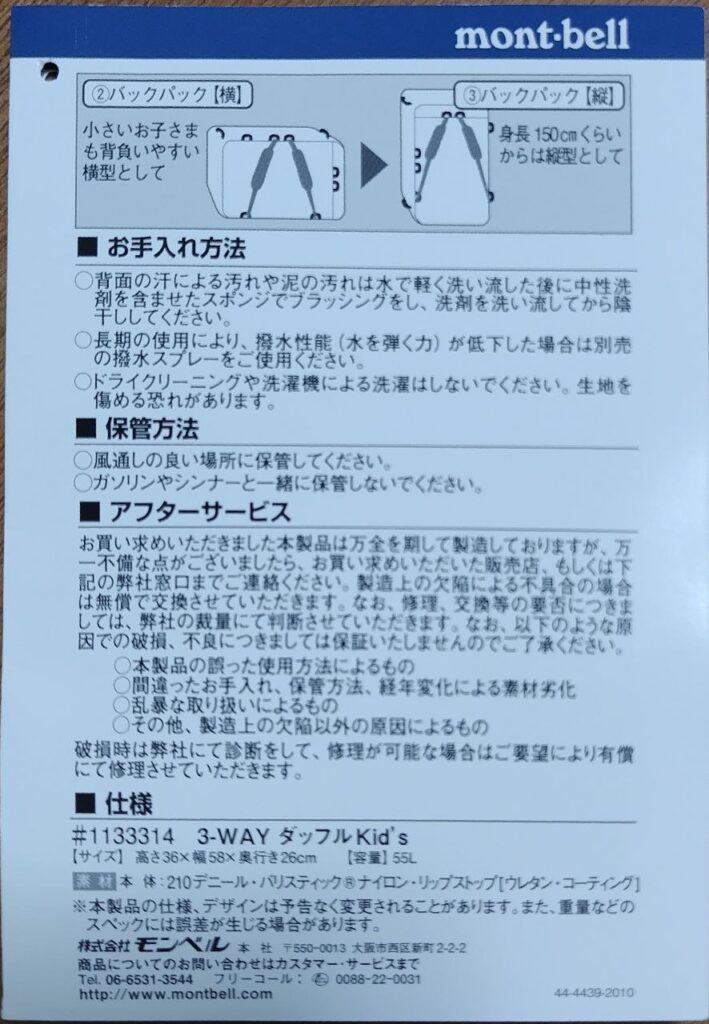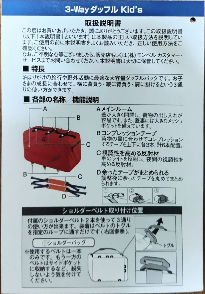 実際に使ったのは、モンベルの3-Way ダッフル Kid’s 55 (#1133314)。