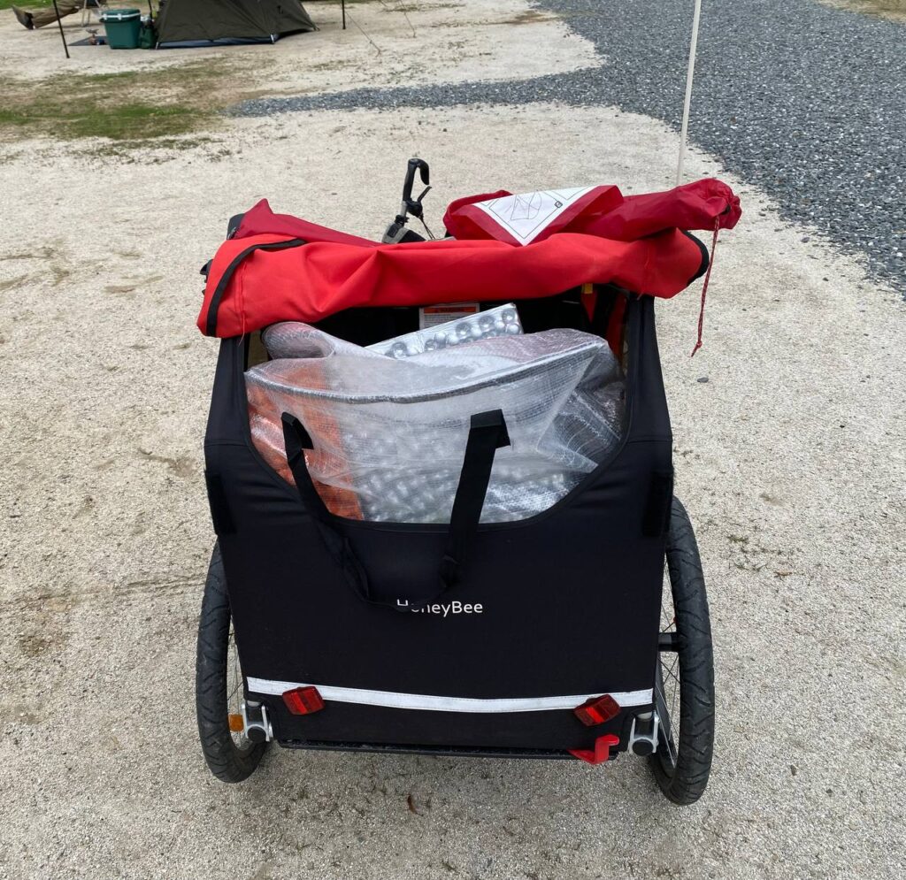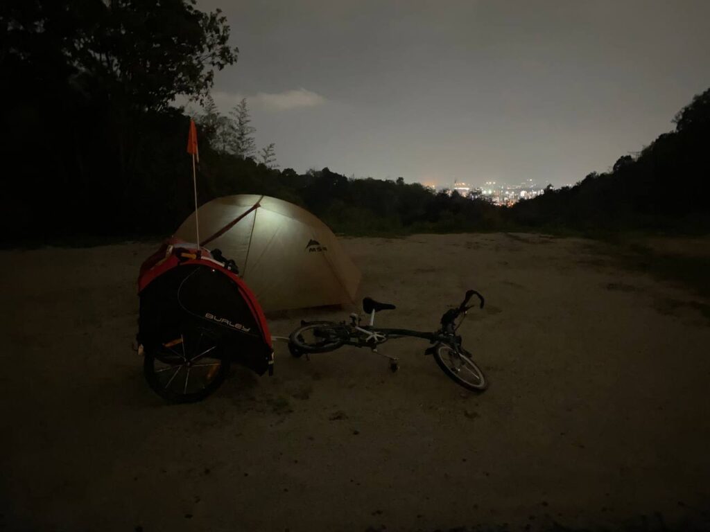 キャンプ道具一式はIKEAのDIMPAに入れて荷室に入れておき、ブロンプトンは同じくDIMPAを輪行袋として、上下逆にして座席に入れます。ブロンプトンを完全に収納することはできないのですが、前面のカバーを面ファスナーで留める順番をうまいこと変えつつ、ぼこっと一部飛び出した状態で運びます。トレーラーから落下しそうになったことはりません。フロントバッグはトレーラーの天板に乗せ、子どもは歩かせます。