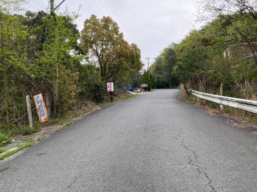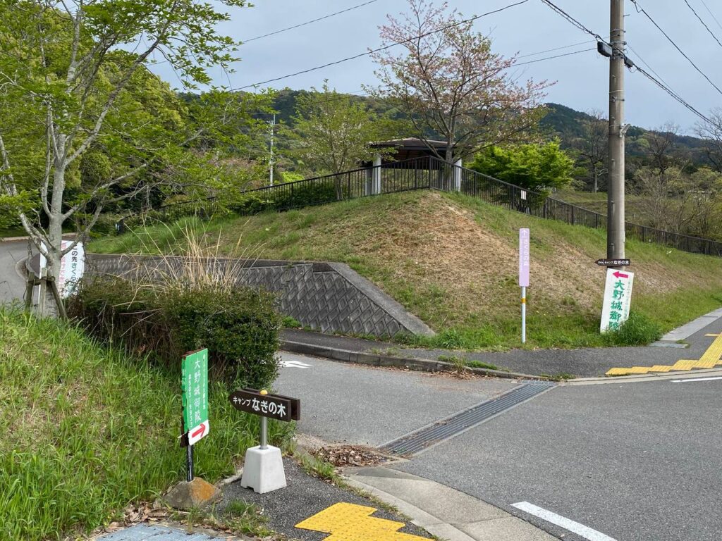 ログに赤↑で記した左折の曲がり角に案内があります。並んでいる看板の大野城御陵というのは、キャンプ場の先にある霊園です。