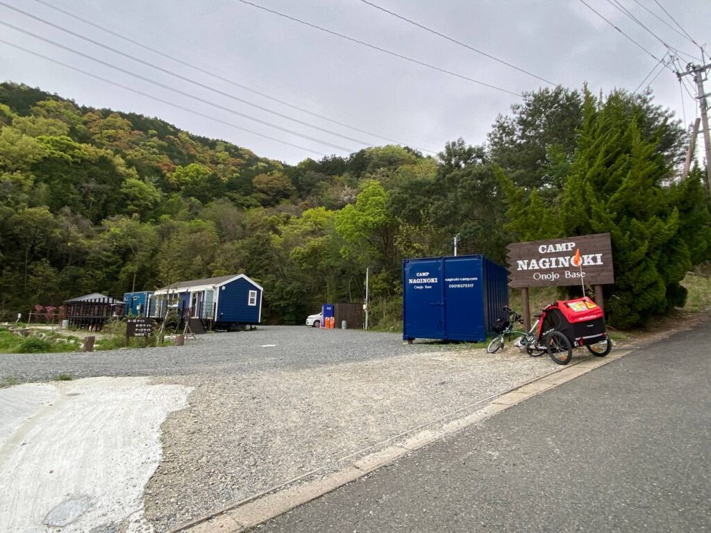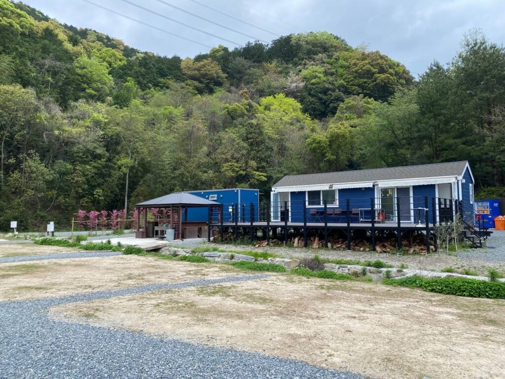 屋根のある小屋っぽい所が管理棟、その奥の青い四角の棟がシャワーなのですが、実はどちらもキャンピングカーのトレーラーなのです。管理棟・シャワー棟とサイトの間に小川があります。