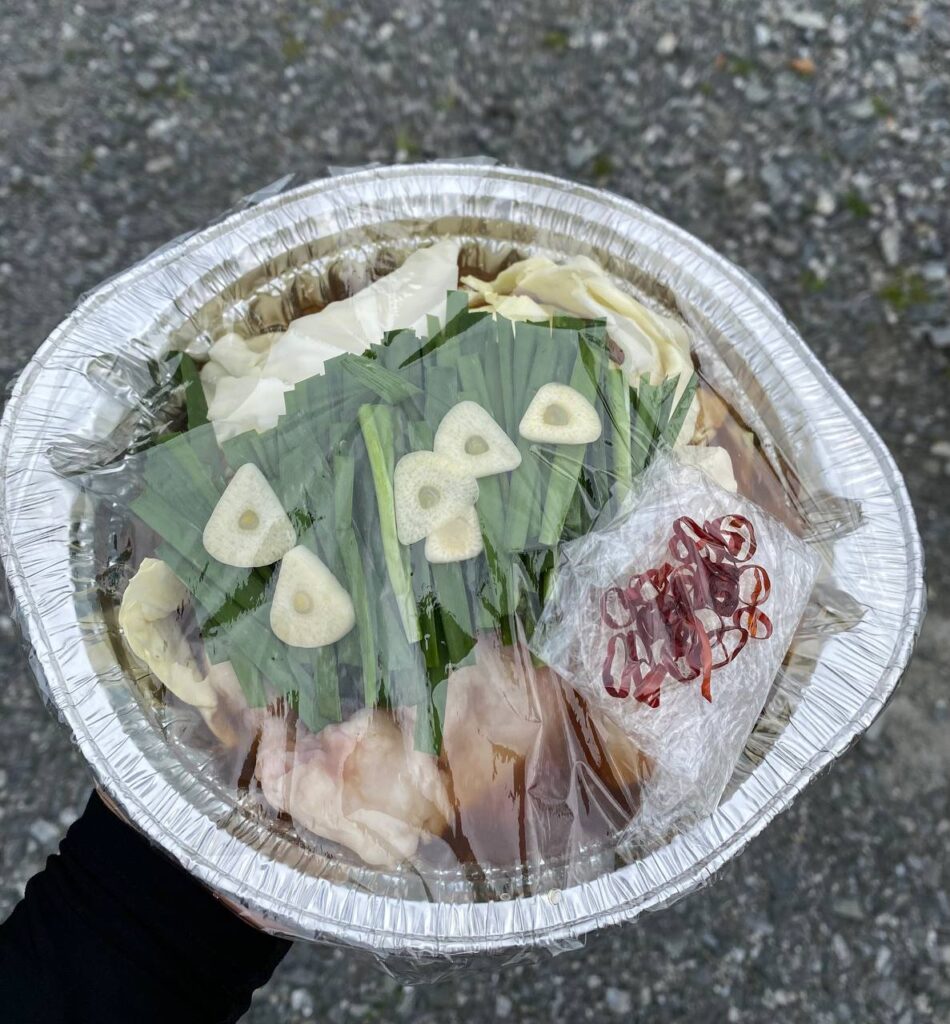 予約していた和牛もつ鍋です。持参の鍋に盛ってもらう場合は100円引きだそうです。