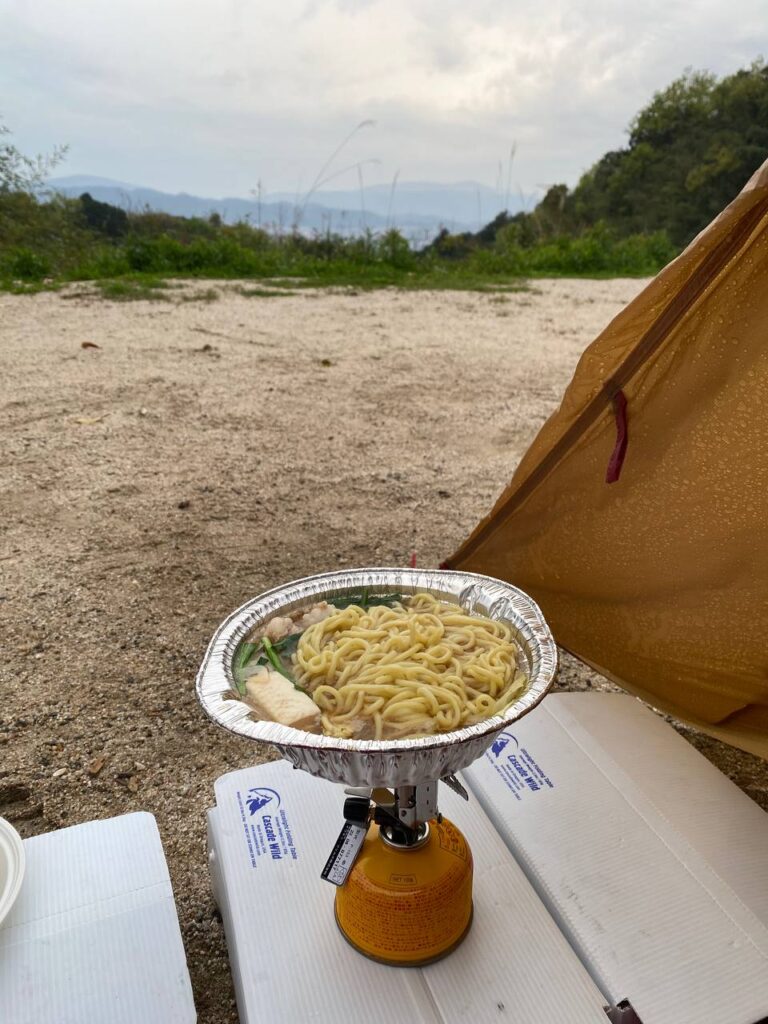 夕方から雨だったので一旦テントに退避して、雨が弱まったのを見計らって夕食にします。