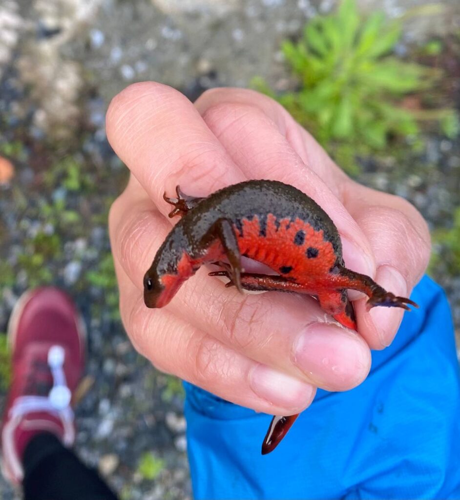 自転車キャンパーの朝は早い。というほどでもないですが、外が明るいのと早寝したのとで、子どもも6時にすっきり起きました。トイレに行って帰りに通り道の小川をふと見ると、泳ぐのが下手なトカゲがいます。”いや、トカゲじゃなくてもしかして…”と思って捕まえてみると、