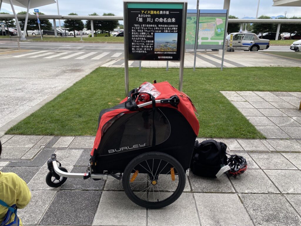 夕方に旭川に到着。私たちの手荷物がレールに出てきたのを子どもが目ざとく見つけて声を上げます。3歳児は多少戦力になりますね。自転車は直接手渡しで受け取れます。この場でトレーラーを組み立ててベビーカーモードにして、荷物を荷室に移して、座席にブロンプトンを上下ひっくり返して載せて外に出ます。外は日が暮れかけていて、東のほうにやってきたことを実感します。