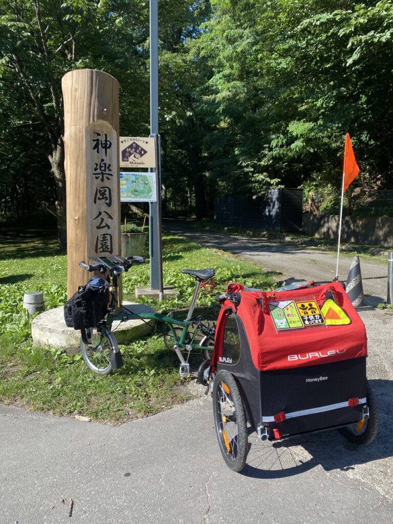設営が済んだら友人との夕食に。テントの入口にはダイヤルロックをして、チャイルドトレーラーはテントと一緒にチェーンでロックして、自転車だけ持って出掛け、隠れ家的なレストランで食事をしました。友人は、旭川は車でも強引な割り込みがほぼなく運転しやすく、地元の人たちが温かくてすごく暮らしやすいと言っていました。これからの旅が楽しみになる話でした。