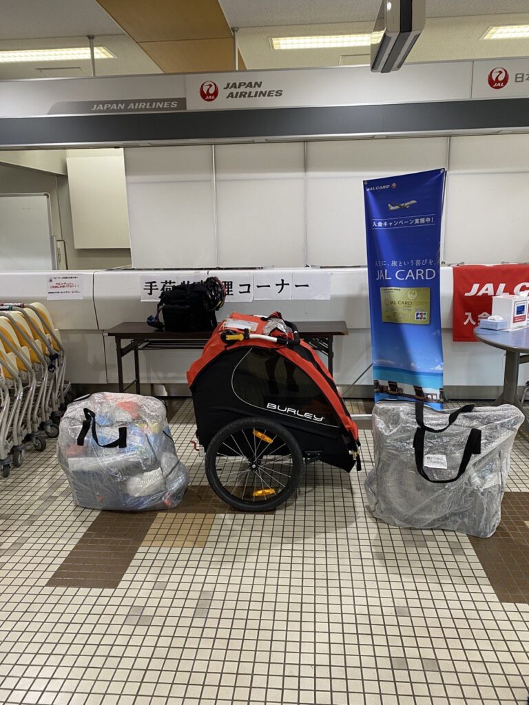 自転車をブロンプトンにした理由は、北海道はそれほど登坂するイメージがなくていけるだろうという見込みと、1人で荷物を管理するにあたってブロンプトンはチャイルドトレーラーに載せやすいから、でした。一見大荷物ですが、手荷物預かりはこれで問題ありませんでした。