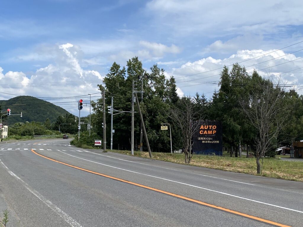 お店の前の自販機で飲料を買い足して、もう8kg進めばキャンプ場です。