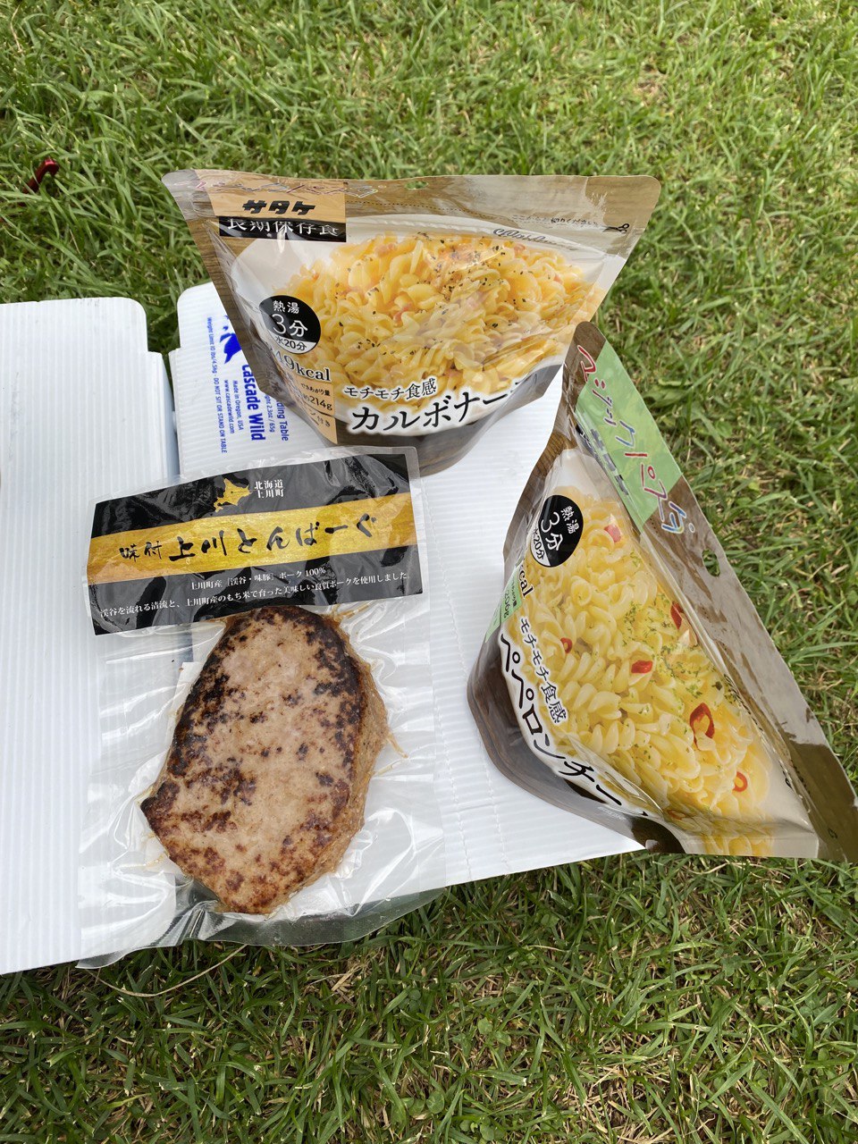 先ほど買った冷凍の上川トンバーグをお湯で温めます。家から持って来た乾燥パスタに乾燥野菜を入れて、あとはお吸い物。
