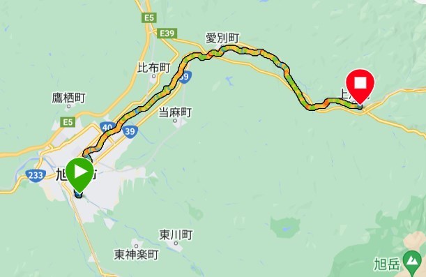 2日目9:30、約51km・累積標高298mの平坦ルートで上川ファミリーオートキャンプ村を目指します。ルートは「道北サイクリングルートWebマップ」の旭川層雲峡自転車道線を参考に作りました。このサイトは2022年7月にオープンしたばかりですが、行きたい地域が含まれていれば自転車で走りやすい道を選ぶのに有効利用できそうです。この日の走行は以下の通り。
