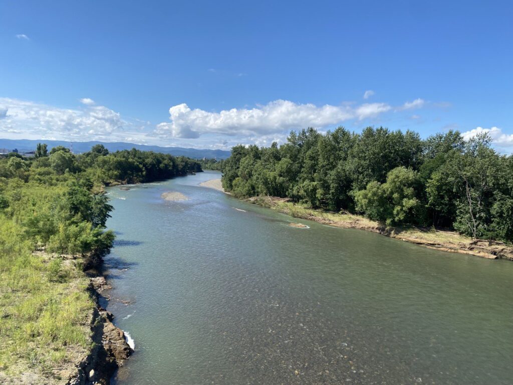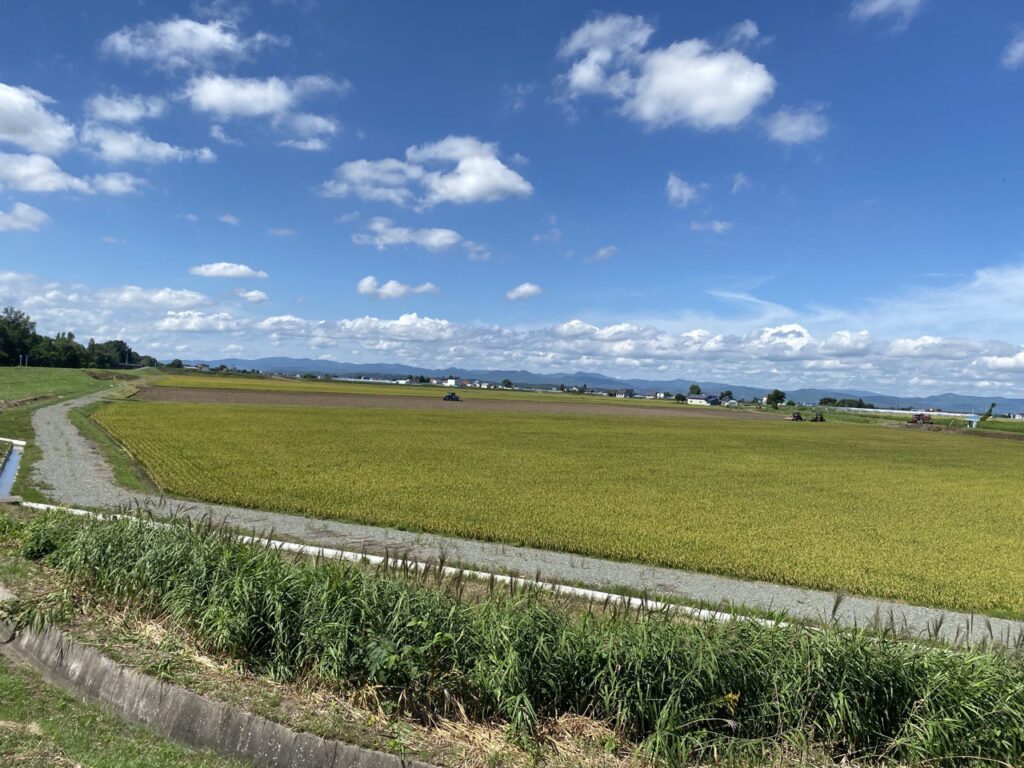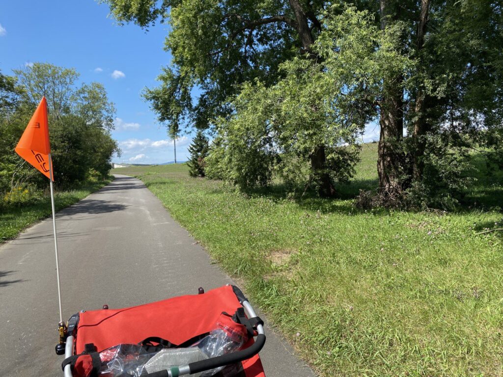 牛朱別川(うしゅべつがわ)を渡り、石狩川に沿って自転車道を進みます。自転車道には枝が結構落ちていて減速を余儀なくされ、トレーラーの跳ね上げている前輪に枝が刺さるということも。何かの綿毛(ポプラ?)がたくさん転がっている所もありました。週末で晴天にも関わらず自転車乗りには数人会うのみ。メタルクワガタが出没する淀川とは大違いで、気持ちよく走れる道で理想のサイクリングロードです。見晴らしがよいところで写真をいつもよりたくさん撮りました。ただ、同じような川沿いや畑の景色がずっと続くので、すごく贅沢なことですが飽きてきてしまうのも事実です。