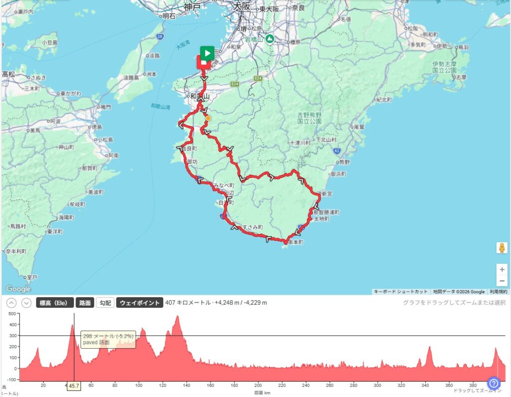 400kmでRide with GPSでは累積標高4200m程度だが、案内ページでは約4506mとのことだった。重量があるブロンプトンでは登坂はなるべく遠慮したいのだけど、山も川も海も岩も景色のよい和歌山県を走るのが私は好きなので、あまりコースに抵抗はなかった。ロードバイクであれば、普通の400kmは仮眠なしで23時間台で走ることが多い。目標は24時間切りとしつつも、せいぜい25時間台ゴールかなと予想していた。例年、和歌山を走るときはモバイルスタンプラリーのWAKAYAMA800(ウェブサイト)をこなすべく寄り道することが多いが、さすがにその余裕はなさそうだ。