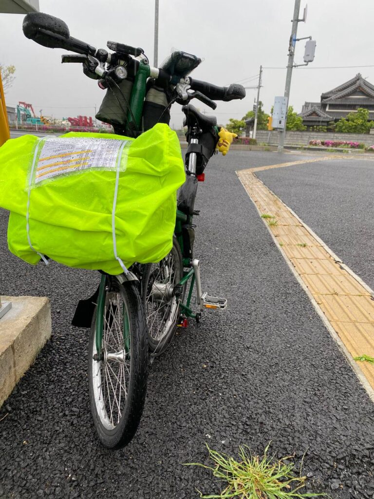 ブロンプトンでキューシートを見るために、普段はラミネートして四隅に穴を開けて単語帳のリングでフロントバッグのベルトに固定している。が、雨天時はバッグにカバーをするのでベルトが使えなくなってしまう。そこで、この日は四隅の穴にいわゆるパンツのゴムを通しておいて、フロントバッグの左右に回してバンドする方法にしてみた。前からの風でばたつくが、たまに確認していれば外れることはなかったし、一応合格かと思われる。問題はページをめくるのが難しいことと、ゴムの色が白でダサいことだ。