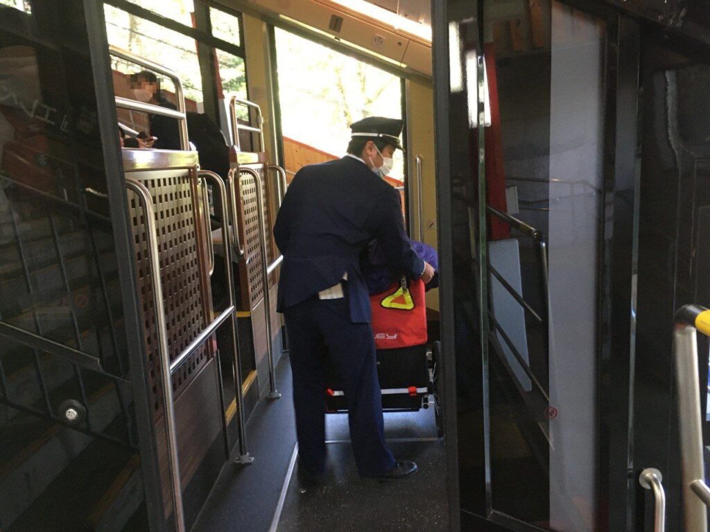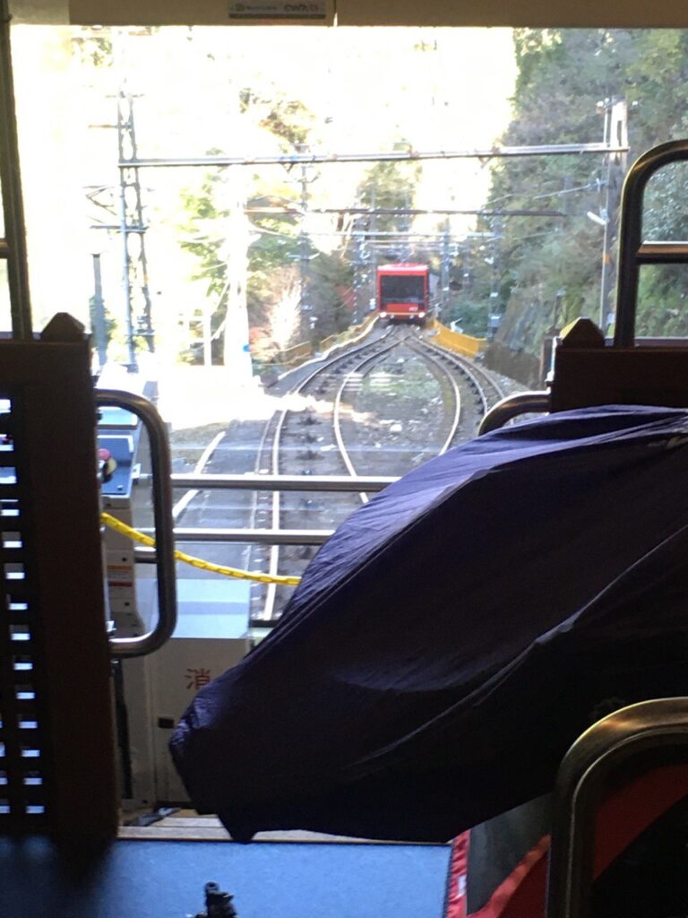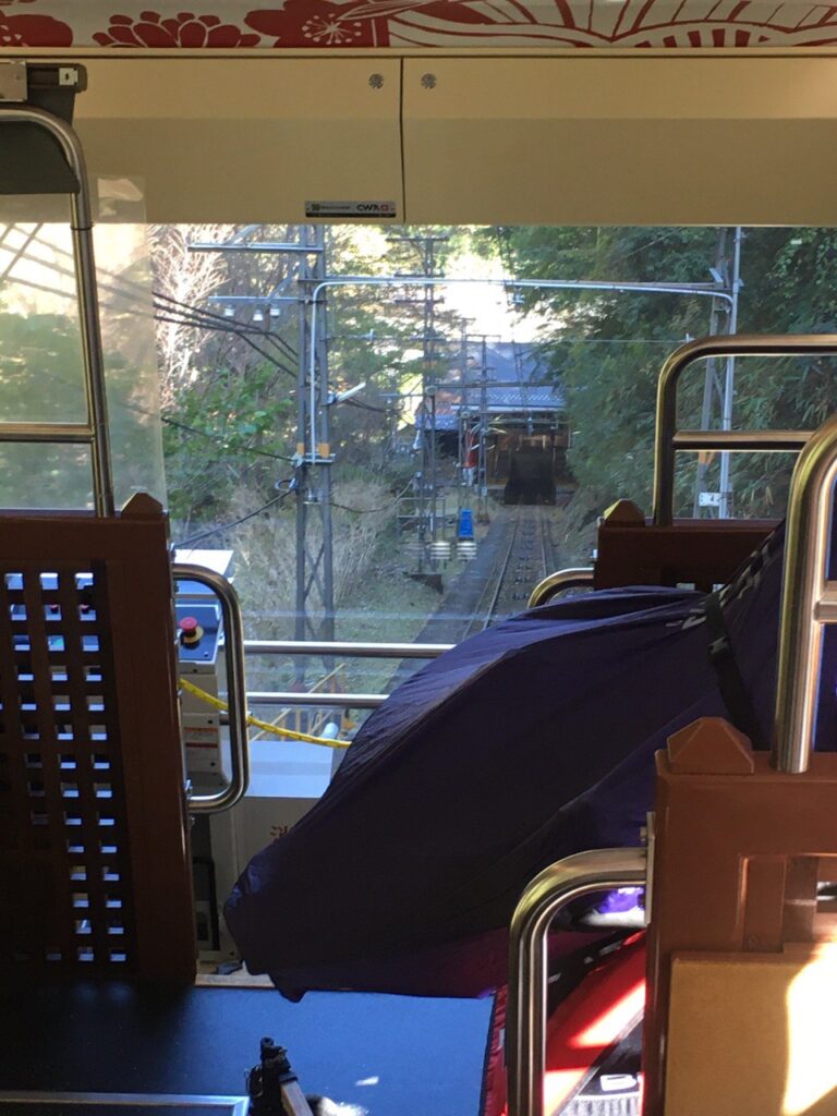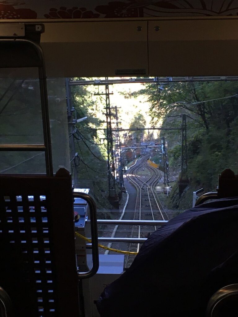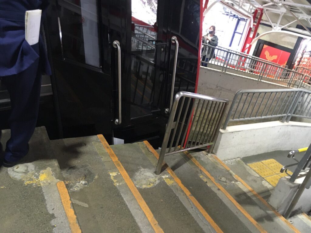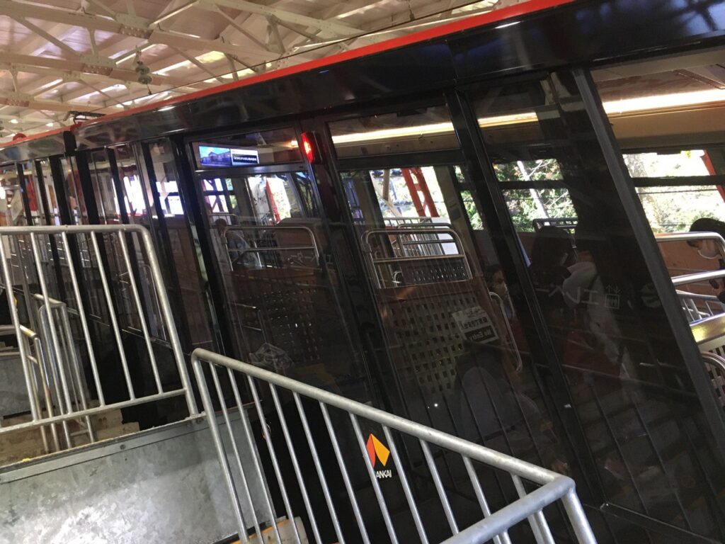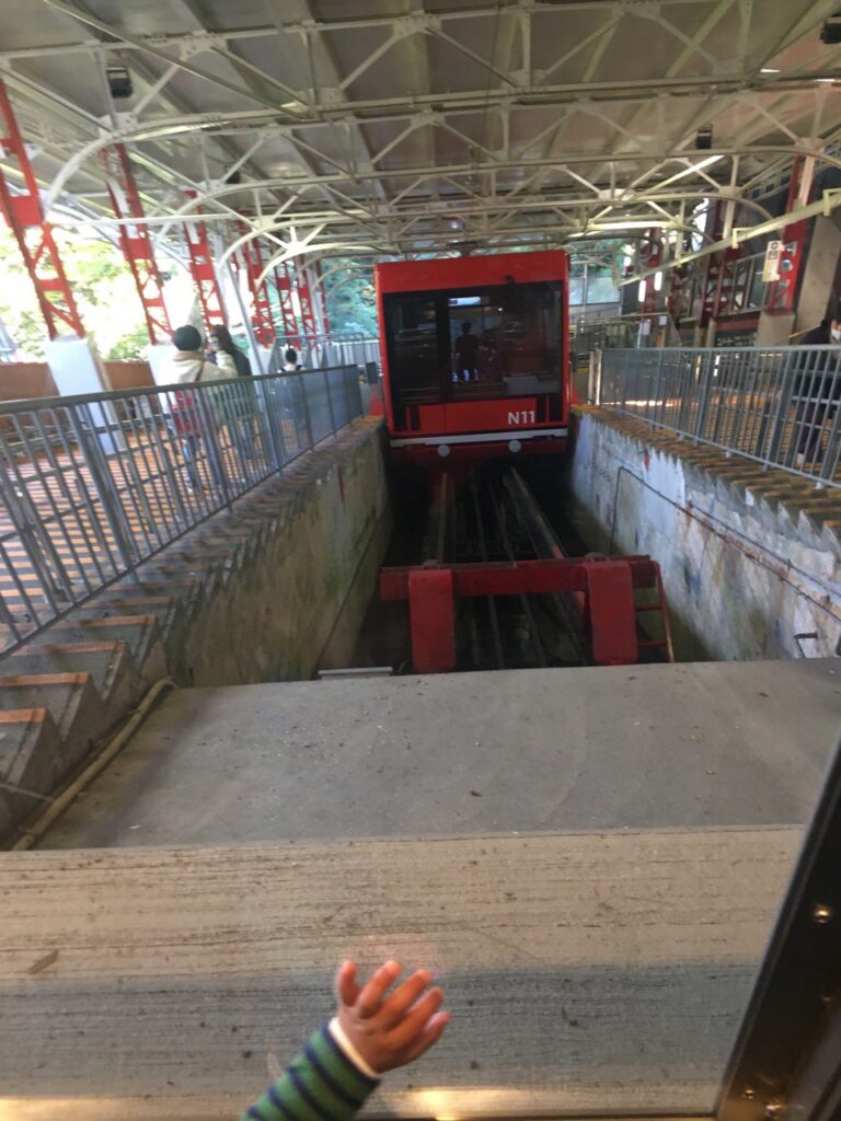 乗車時間が近づいたので、また1階に降りて改札前で待機します。表現が難しいのですが、ケーブルカーは車両が斜めに停まっていて、ホームは階段状になっています。トレーラー・ベビーカーや車イスが乗るのは先頭車両で、トレーラーを駅員さんに押していただき、案内に従ってエレベーターでホームに降りて行きます。