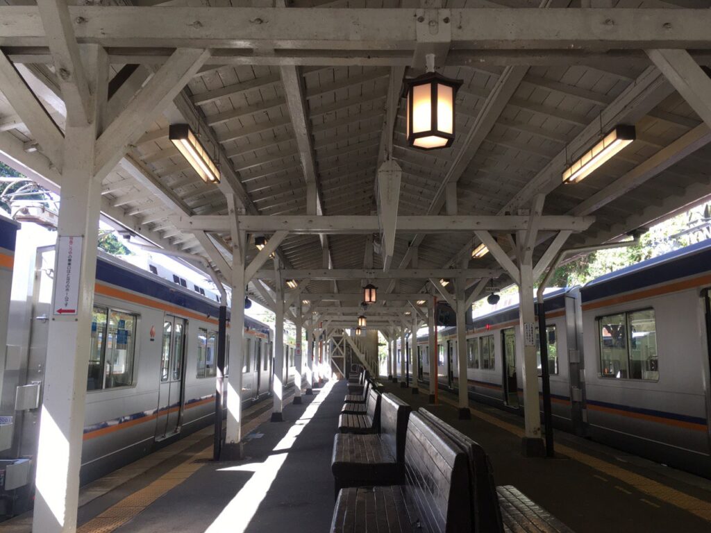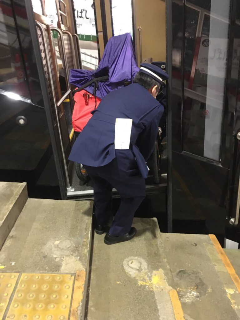 極楽橋駅はホームから階段がこの通り続いており、トレーラーを降ろすのに駅員さん2人掛かりで持ち上げて対応いただきました。5段降りればスロープがあるのですが、総重量35kg程度なので改札階まで降ろせると判断されたようで、そのまま2人で階段を運んで降ろしてくださりました。この後の南海高野線は自力で行ける段差なのですが、乗るときも見守っていただき、果てやなんば駅で降りるときはスロープまで持って来ていただき、恐縮しきりでした。南海電車、今後ひいきにします。