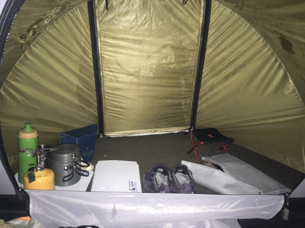 前室はこの通りで、テーブルや靴を置いても余裕があります。ここ最近はソロ用テントを2人で使っていたので、2人用テントにしてご飯エリアと寝るエリアを何となくですが分けやすくなったのはよかったです。ただ短辺が入口となっているので、奥から入口のほうに回り込まれて入口に居座られると何もできないのがデメリットです(^-^;