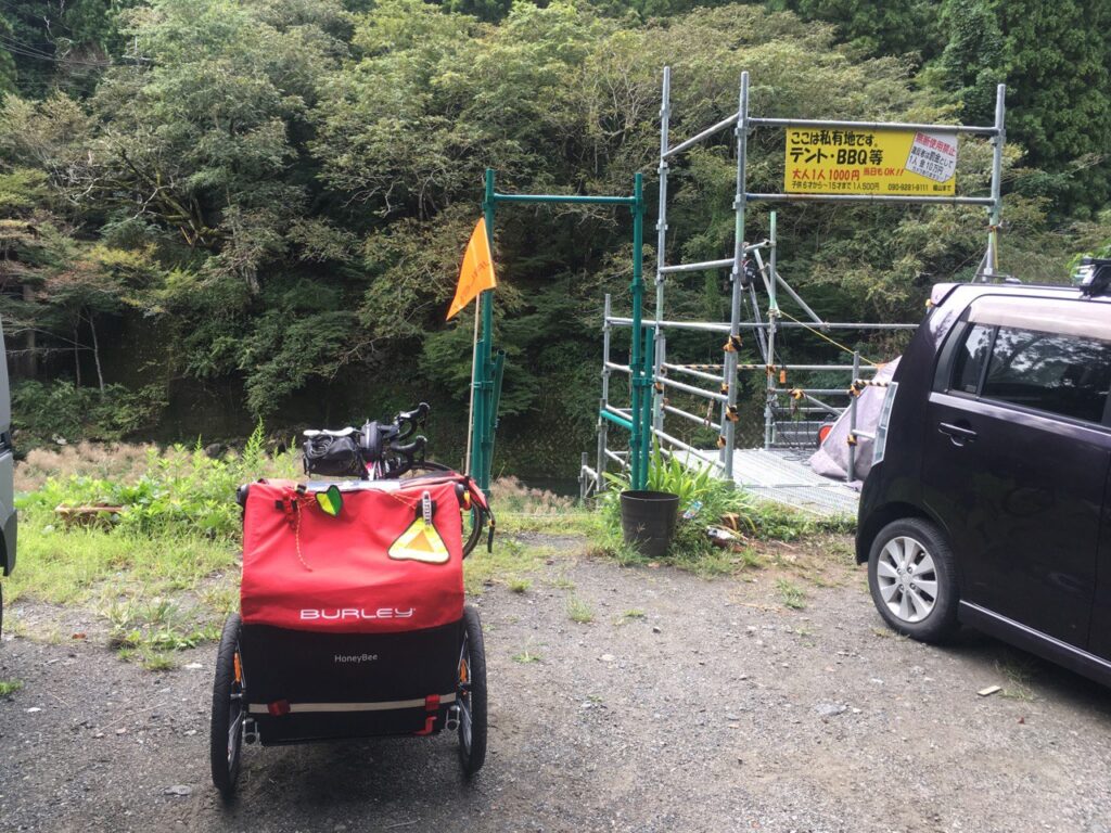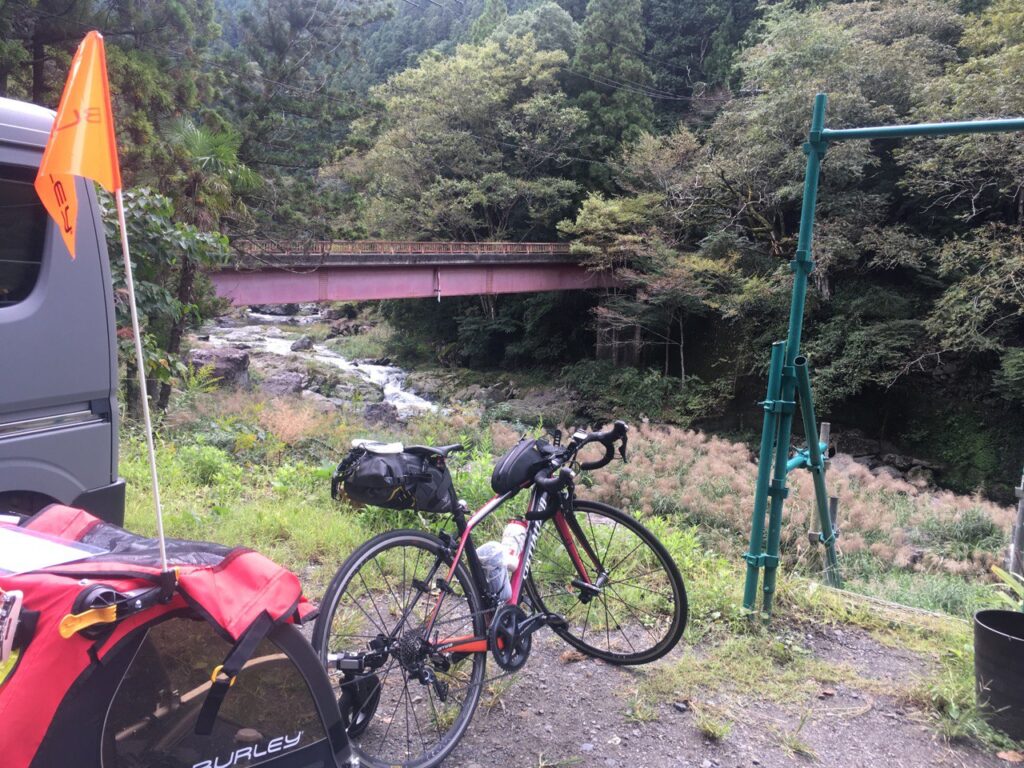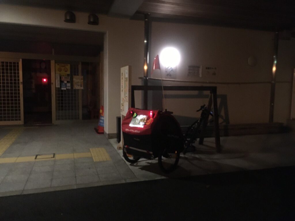 お湯はほどよくぬるぬるした私好みの質感でした。しっかり温まって、今度はキャンプ場まで凸凹した道をゆっくりめに下っていきます。ヘッドライトを付けていると対向車からもよく見えるようで、やや狭い道でしたがすれ違いのときに必ず止まってくれました。まさか自転車だとは、それも子連れだとは思わないだろうなぁ(笑) 子どもはすぐに寝たようでした。この日は合計で56.5km、累積標高475mで終えました。