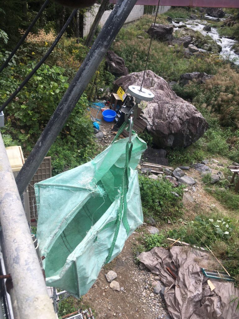 荷物はこの袋に移して、ケーブルで袋を吊った簡易昇降機(発電機+ウインチ)で川岸まで降ろして、サイトまではキャリーに積んで運んでいただきました。子どもは階段を怖がることなく予想外にも危なげもなく自分で降りていこうとしていましたが、最初はオーナーさんに手伝っていただいたので助かりました。