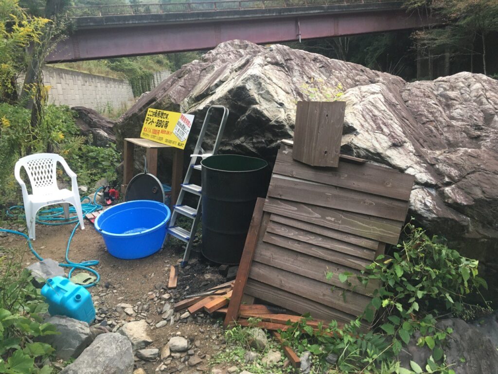 事前に予約するとドラム缶風呂が使えます。自分で薪で沸かして入るのだそうです。ここより高い所にあるトイレからだと見えてしまいますが、夜は灯りもないし、サイトのほうからは見えなくなっています。焚き火が上手になったらこういうのも挑戦してみたいなぁ…。
