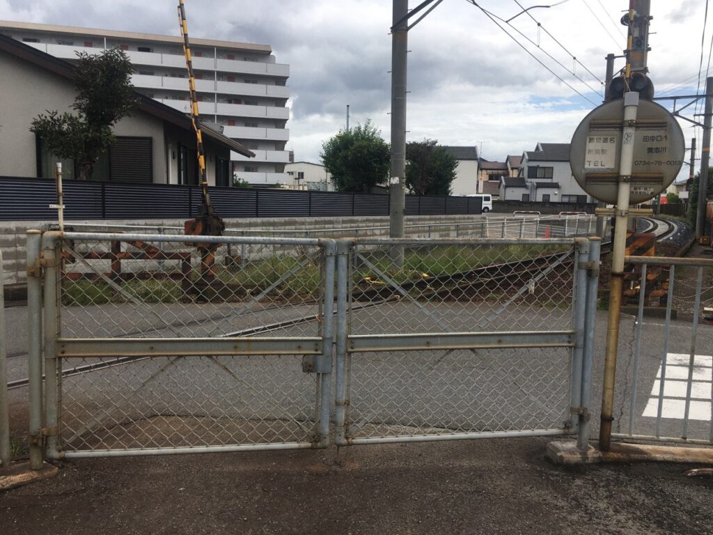 田中口駅構内から撮影。車イス用の扉は踏切内にあるので、電車発着時間に余裕があれば大丈夫なのだけどどきどきしてしまう。上記の参考サイトにもあったように扉自体が大きく、車イスユーザーにはちょっと開閉が難しそう。